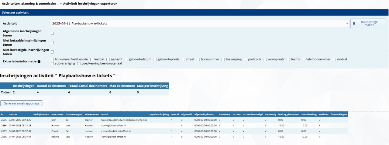 Ben je tevreden kies dan voor "Genereer excel rapportage" om de inschrijving te downloaden in Excel formaat.