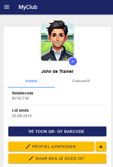 De MyClub pagina in de app toont de gegevens van het ingelogde account.