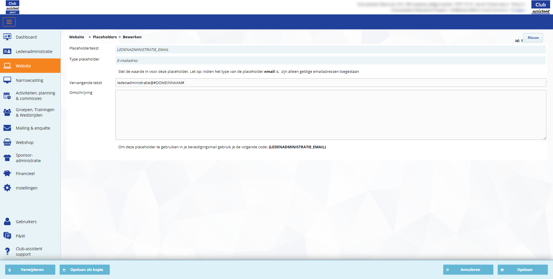 Wanneer een nieuw lid het inschrijvingsformulier verstuurt, ontvangt de ledenadministratie een e-mail met daarin alle gegevens uit het aanmeldformulier van het lid. Wie deze e-mail ontvangt, wordt bepaald door de ingestelde placeholder.