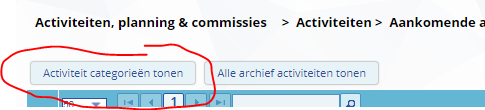 Om een extra categorie aan te maken ga in Club-assistent naar Activiteiten, planning & commissies. Klik vervolgens op Aankomende activiteiten. Boven aan het overzicht zie nu 2 knoppen.