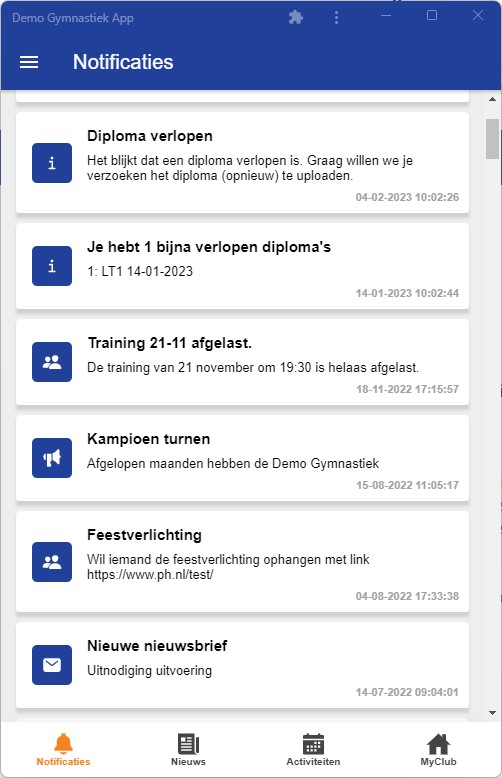 Via het menu selecteer je 'Notificaties' om alle notificaties van de club die naar jou verstuurd zijn te bekijken.