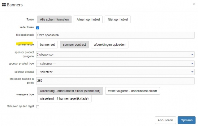 | Weergave type | Maak hier een keuze voor de weergave van de banners op de website (de app houdt hier geen rekening mee) |