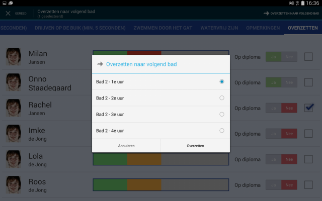 Voorheen kon een leerling vanuit één bad maar naar één ander bad worden overgezet. In de praktijk blijkt echter dat een leerling niet altijd naar hetzelfde bad moet worden overgezet. Daarom kun je nu bij de groepen meerdere baden voor het overzetten opgeven. In de app krijg je vervolgens bij het overzetten de keuze uit de verschillende baden.