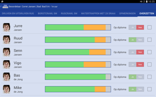 Om het diplomazwemmen verder te ondersteunen, kun je voortaan in de app aangeven welke leerlingen op diploma mogen. Dit doe je in de CA Zwemscore app door bij het overzetten naar het volgende bad 'Op diploma' op 'Ja' te zetten. Vervolgens kun je deze leerlingen eenvoudig een mailing sturen door hierop te filteren bij het aanmaken van een mailing.