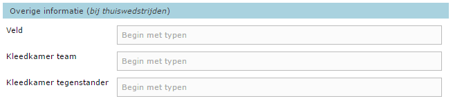 Heb je veel velden/banen/baden/etc. en een hoop kleedkamers, dan kan het selecteren van velden en kleedkamers bij wedstrijden een hoop scrollwerk zijn. Daarom hebben we nu autosuggest toegepast: jij begint met typen, wij vullen aan. Dat maakt het indelen van wedstrijden weer een stukje gemakkelijker.
