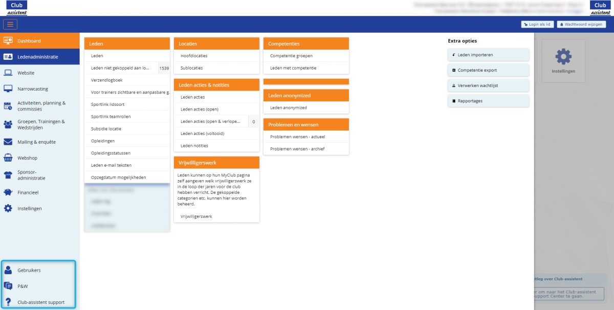 De knoppen gebruikers, P&W en club-assistent support zijn van standaard rechts bovenin de blauwe balk verplaatst naar het uitklapmenu, zodat deze ook nog steeds op iedere pagina bereikbaar zijn. Linksbovenin de blauwe balk heb je 3 oranje streepjes. Als je op de 3 oranje streepjes klikt, kan je het menu in- en uitklappen.