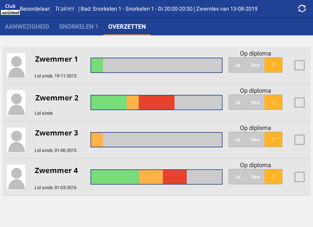 Voor de zwemcoach app hebben we de 'Mag op diploma' functionaliteit aangepast naar Ja / Nee / ? (onbekend). De zwemclub kan inzien welke beoordlingen het lid heeft gekregen en hoe ver hij/zij in het proces zit. Dit wordt weergegeven met de gekleurde procesbalk op de overzetten tab.