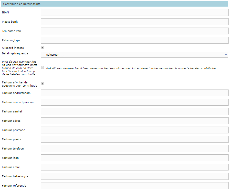 In sommige gevallen moet de factuur niet naar het lid verzonden worden, maar bijvoorbeeld naar de gemeente, een sportfonds, of een werkgever (bij EHBO). In de ledenadministratie hebben we hiervoor extra velden toegevoegd bij de lidgegevens om dit per lid in te kunnen vullen. Als je bij een lid de checkbox 'Factuur afwijkende gegevens voor contributie' aanvinkt wordt er een rits aan velden zichtbaar voor de afwijkende gegevens van de factuur. Dit is voor nu alleen in te vullen door de ledenadministratie of administrator. De factuurqueries bij een factuurronde zijn aangepast op deze gegevens.