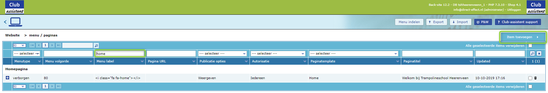 Ga naar de module website → menu / pagina’s. Hier zie je een lijst van alle pagina’s op de website. Klik voor het aanmaken van een pagina op ‘item toevoegen’ en richt de pagina in.aanpassen