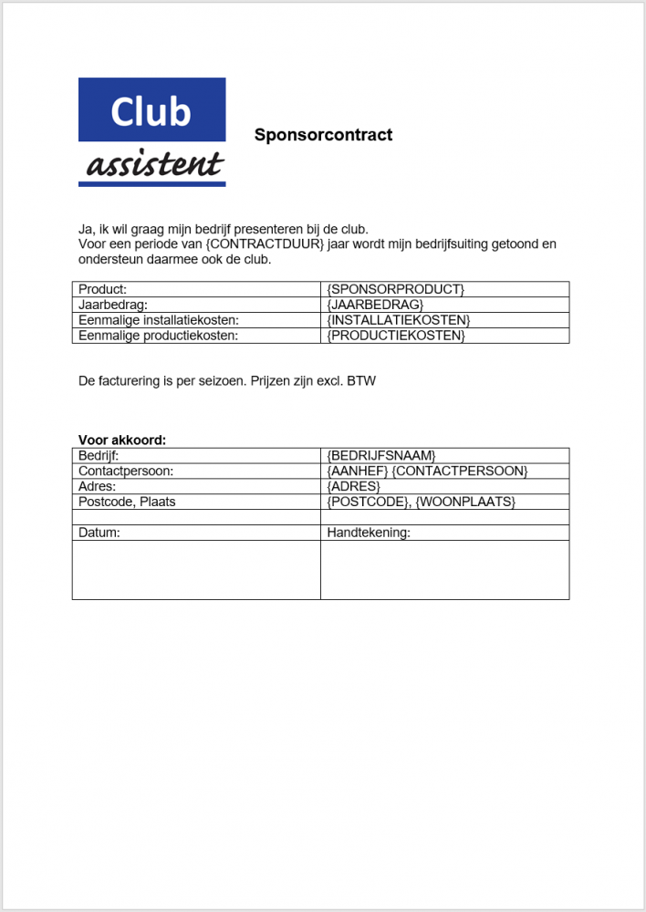 Contracten kunnen met Club-assistent automatisch gemaakt worden voor de sponsoradministratie. Zo hoeft de vereniging niet zelf de informatie in te vullen in een Word documentje, maar wordt het contract gevuld met info die in de sponsoradministratie staat volgens een vast stramien.