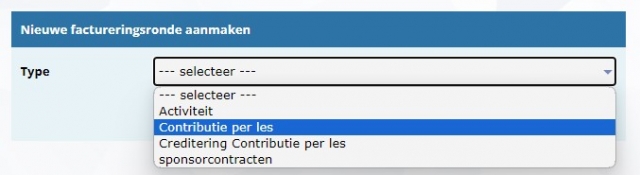 - Je kiest eerst waarvoor je de facturen wilt maken. Selecteer hier 'Contributie per les' en klik op volgende.