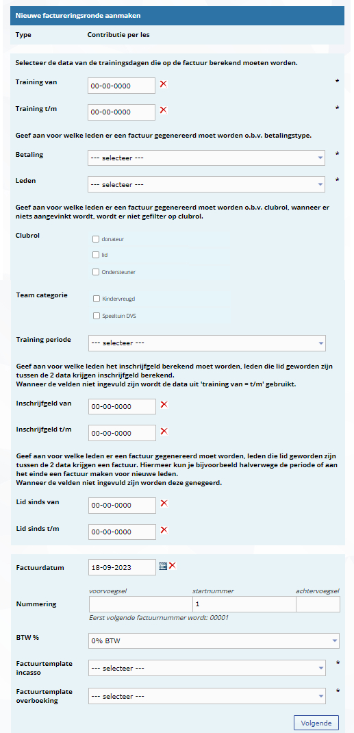 Training van Wat is de datum van de eerste training die moet worden gefactureerd. Training t/m Wat is de datum van de laatste training die moet worden gefactureerd. Betaling Leden kunnen per incasso of per overboeking betalen. Hier kiest je of je 1 van deze groepen wilt factureren of iedereen. Leden Leden kunnen zelf betalen of via de gemeente of een sportfonds subsidie ontvangen. Hier kiest je of je enkel, de leden die zelf betalen, de leden die via de gemeente of een sportfonds subsidie ontvangen, of alle leden wilt factureren Team categorie Als je niet alle leden in alle team categorieën wilt factureren, selecteer je hier de categorieën die je wel wilt factureren. Trainingsperiode Als je meerdere trainingsperiode hebt ingesteld en je, tussen de data die je hierboven ingevuld hebt, maar 1 van de periodes wilt factureren. Kies dan hier de trainingsperiode die je wilt factureren. Als je niks kiest wordt er enkel naar de data gekeken. Inschrijfgeld van Hier kun je aangeven vanaf welke datum een kind lid moet zijn geworden om inschrijfgeld te moeten betalen. Als je dit veld leeg laat moet je het veld 'Inschrijfgeld t/m' ook leeg laten en wordt voor de data uit de velden 'Training van' en 'Training t/m' gebruikt. Inschrijfgeld t/m Hier kun je aangeven tot welke datum een kind lid mag zijn geworden om inschrijfgeld te moeten betalen. Als je dit veld leeg laat moet je het veld 'Inschrijfgeld van' ook leeg laten en wordt voor de data uit de velden 'Training van' en 'Training t/m' gebruikt. Lid sinds van Geef hier aan vanaf welke datum leden lid moeten zijn om gefactureerd te worden. Als je dit leeg laat moet je ook 'Lid sinds t/m' leeg laten en worden deze 2 velden genegeerd. Lid sinds t/m Geef hier aan vanaf welke datum leden lid moeten zijn om gefactureerd te worden. Als je dit leeg laat moet je ook 'Lid sinds van' leeg laten en worden deze 2 velden genegeerd. Factuurdatum Dit is de datum die je op de factuur wilt hebben staan. Nummering Dit zijn 3 nummers waaruit de factuurnummers zullen worden gegenereerd. - Het voorvoegsel is voor alle facturen hetzelfde en kun je gebruiken om factuurnummers te groeperen. Dit veld is verplicht.