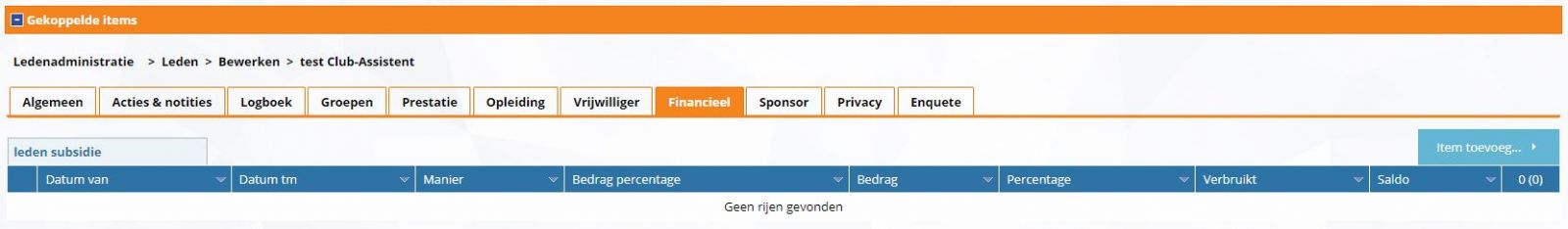 De subsidiebedragen kan je invullen onder de gekoppelde items van het lid. Deze items vind je zodra je naar beneden scrollt op de lidpagina. Mochten deze items gesloten zijn dan kan je ze openen door op het plusje te klikken. Daarna ga je naar het tabje "Financieel" en dan kan je onder de sectie "leden subsidie" de subsidie bedragen toevoegen door op de blauwe knop "Item toevoegen" te klikken.