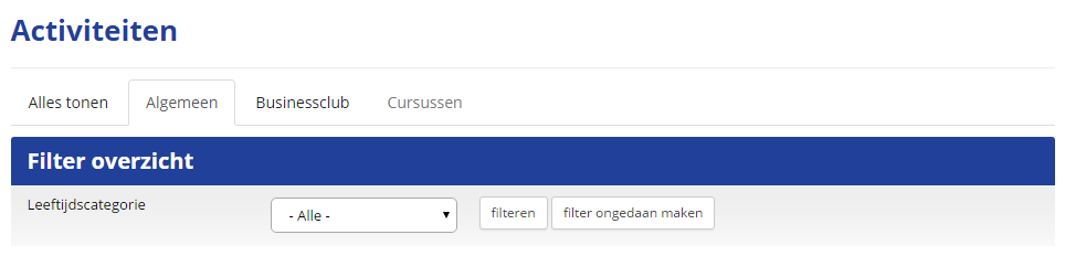 - Het filter wordt alleen getoond binnen de activiteitencategorie waaraan de eigenschap is gekoppeld en dus niet in het overzicht met álle activiteiten.