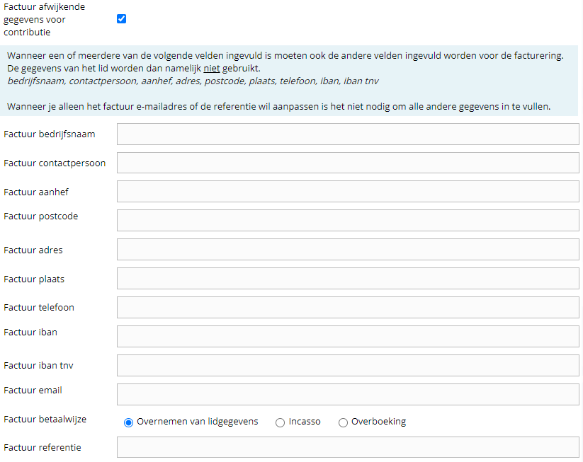 Wanneer een of meerdere van de volgende velden ingevuld is moeten ook de andere velden ingevuld worden voor de facturering. De gegevens van het lid worden dan namelijk niet gebruikt.