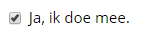 Checkbox groep: geef de inschrijver een enkele of meerdere optie(s) om wel of niet aan te vinken. | Voeg een hekje toe achter de waarde(n) die standaard aangevinkt moet(en) zijn. Tekst gescheiden door puntkomma’s bij meerdere opties. Bij meerdere opties: Ja, ik doe mee.#;Nee, ik doe niet mee. |