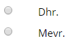 Radiobutton groep: geef de inschrijver een enkele keuze uit een lijst met bolletjes. | Scheid de verschillende opties met een puntkomma. Voeg een hekje toe achter de waarde die standaard aangevinkt moet zijn. Voorbeeld: Dhr.;Mevr. |