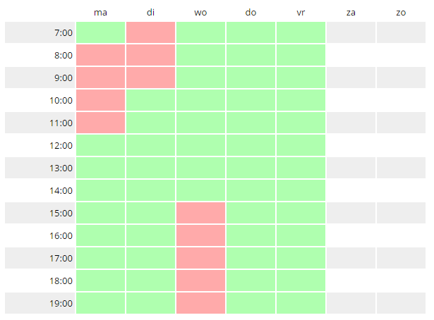 Verhinderingen: toon de inschrijver een weekplanning met dagen en tijden om verhinderingen/ beschikbaarheid op te geven. |
