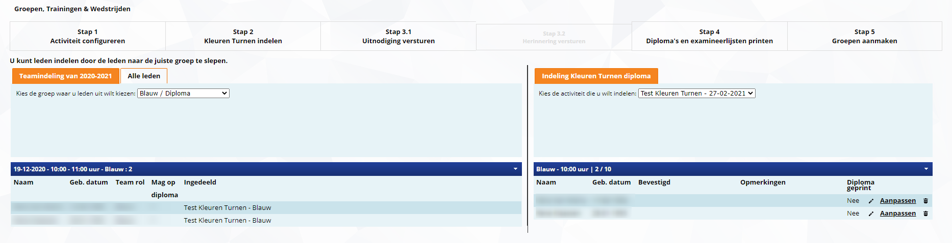 In de tweede stap ga je de Kleuren Turnen activiteit indelen. Dit scherm werkt hetzelfde als het indelen van de groepen. Het enige verschil is dat je in het linker scherm de teams/groepen van het huidig seizoen ziet en in het rechter scherm heb je de verschillende tijdsblokken van de activiteit.