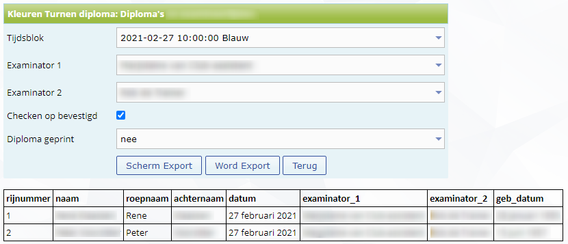 In dit scherm kan je per tijdsblok een export maken van de diploma's.