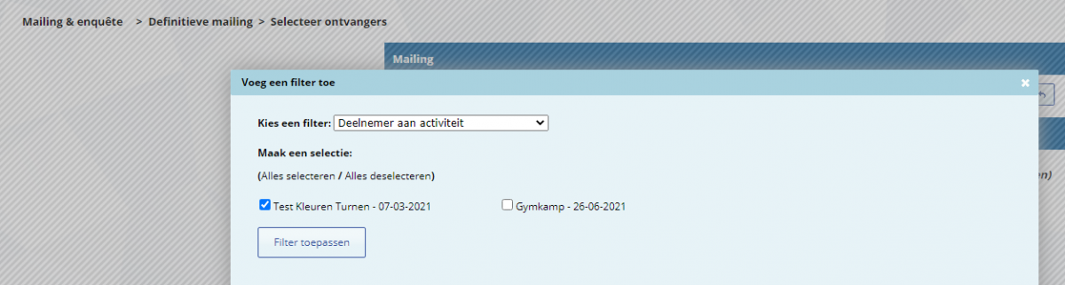 De verzending van de uitnodigingen verloopt dan op dezelfde wijze als het versturen van de nieuwsbrieven. Met als enige verschil, dat je de doelgroep 'Activiteit inschrijvingen' gebruikt en hier het filter 'deelnemer aan activiteit' moet instellen met de juiste activiteit.