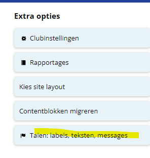 Ga in Club-assistent naar Instellingen. In de sectie Extra opties (rechts in het uitklapmenu) vind je de knop met de tekst "Talen: labels, teksten, messages". Klik op deze knop en je komt uit bij het volgende scherm waar je een keuze uit de knoppen Labels, Messages en Texts moet maken.
