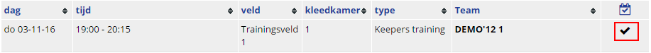 | Mijn komende trainingen | Hier zie je de komende trainingen waar je aan deelneemt. Ook kan je je afwezigheid doorgeven door achter de training op het vinkje te klikken. Dit vinkje verandert dan in een potloodje. Er opent een nieuw schermpje waar je kan doorgeven dat je niet aanwezig kan zijn bij deze training en waarom. |