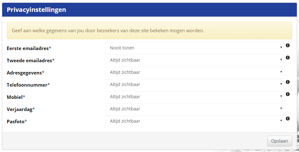 Je kunt hier instellen wat je privacy instellingen zijn. Je informatie zoals je e-mailadres, adresgegevens, telefoonnummer, mobiele nummer, verjaardag en pasfoto kunnen namelijk op sommige plekken op de website worden getoond. Lees hier hoe je privacyinstellingen kunt aanpassen.