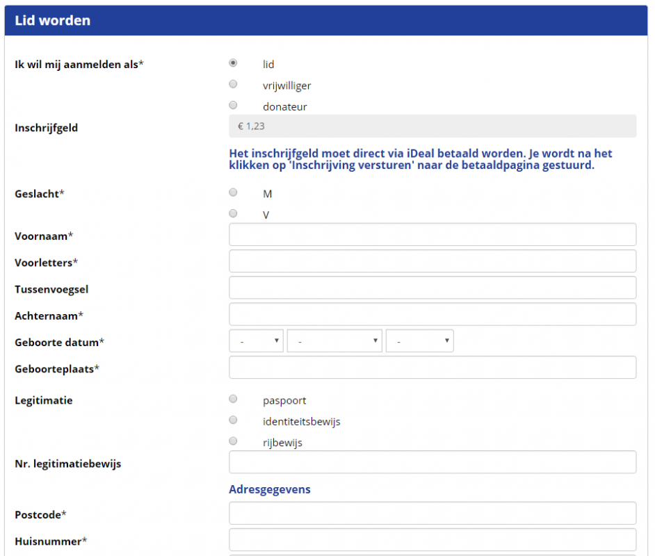 Wij stellen op basis van het type club en het land waarin je club actief is een aanmeldformulier op. Wanneer je aanvullende wensen hebt met betrekking tot het aanmeldformulier, dan kun je dat bij ons aangeven via Support tickets. Wij passen het formulier dan voor je aan.