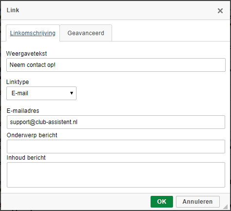 | Een link naar een pagina in de website (interne link) | Wil je een link toevoegen naar een pagina in de website dan is het het beste om bij het protocol <ander> aan te klikken. Bij de url vul je dan alleen het gene in wat achter de domeinnaam komt. Op deze site is dat bijvoorbeeld: support.club-assistent.nl. |