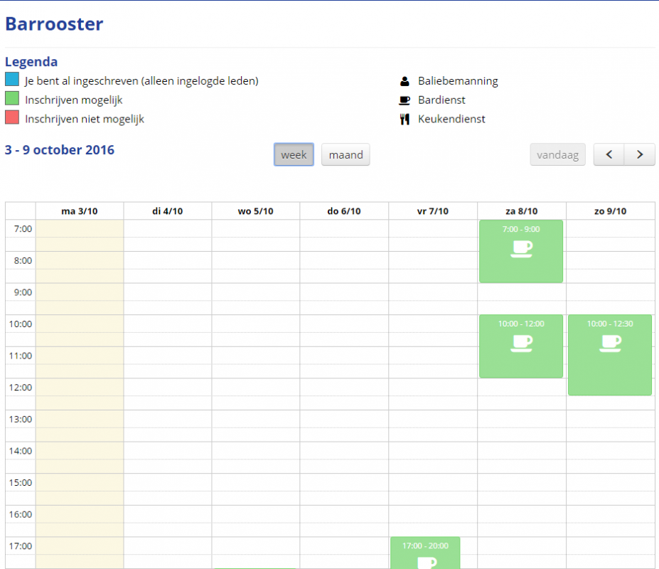Ga naar de website en vervolgens naar de pagina waar het (Bar)rooster op staat. Eerder in deze tutorial is al uitgelegd hoe je zo'n pagina aanmaakt. Dan zie je het rooster met daarin de diensten. De diensten waar je je voor kunt inschrijven zijn groen. Klik op de dienst waar voor je je wilt inschrijven.