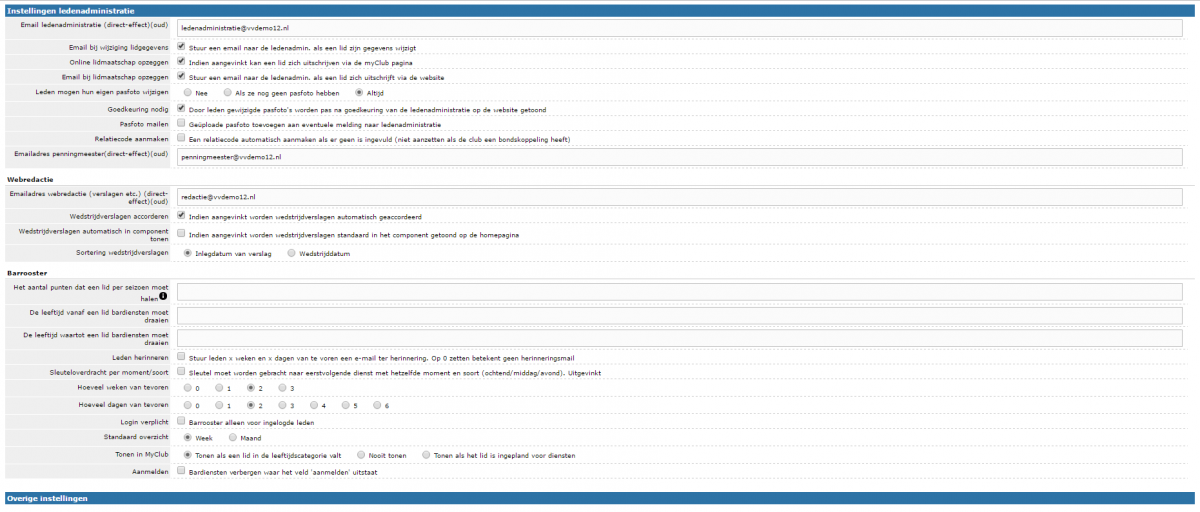 Voor het (Bar)rooster zijn een aantal instellingen mogelijk. Wat deze instellingen zijn en waar je deze kunt vinden kan je hier lezen. Om de instellingen te bekijken ga je in Club-assistent naar "Instellingen" vervolgens klik je bovenaan in de balk op "Clubinstellingen". Nu scroll je bij "Algemene instellingen" naar beneden tot je het kopje "Instellingen ldedenadministratie" ziet, hier onder valt het kopje "Barrooster".