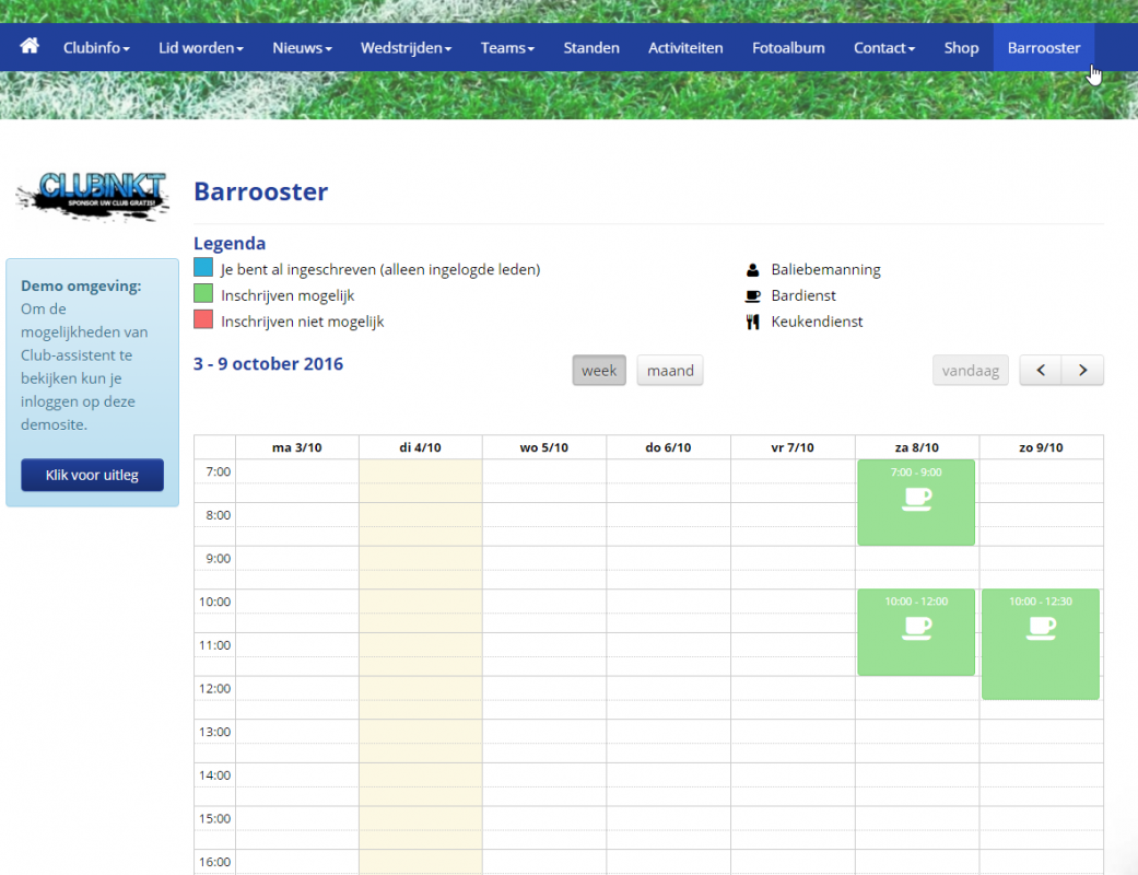 Veel clubs hebben een kantine, balie of een keuken, en hier wordt vaak gebruikgemaakt van een rooster. Met het barrooster/ dienstenrooster van Club-assistent laat je leden zelf hun diensten inplannen zodat je bar of balie altijd bemand is.