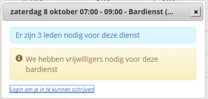 Heb je op de dienst geklikt, dan wordt aangegeven hoeveel leden voor deze bardienst nodig zijn. Als je niet ingelogd bent wordt een linkje naar de inlogpagina doorgestuurd, want alleen ingelogde leden kunnen zich inschrijven voor een (bar)dienst.