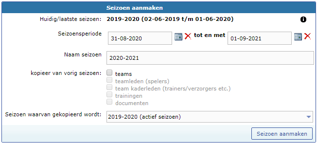 | Kopieer van vorig seizoen | Hiermee geef je aan wat er moet worden meegenomen van het huidig/afgelopen seizoen. Teams neemt alle teams/groepen mee, Teamleden alle spelende leden in de teams/groepen, Team kaderleden alle leden met extra functies, Trainingen alle trainingen van de teams/groepen en Documenten neemt alle documenten mee die aan het team zijn gekoppeld. |