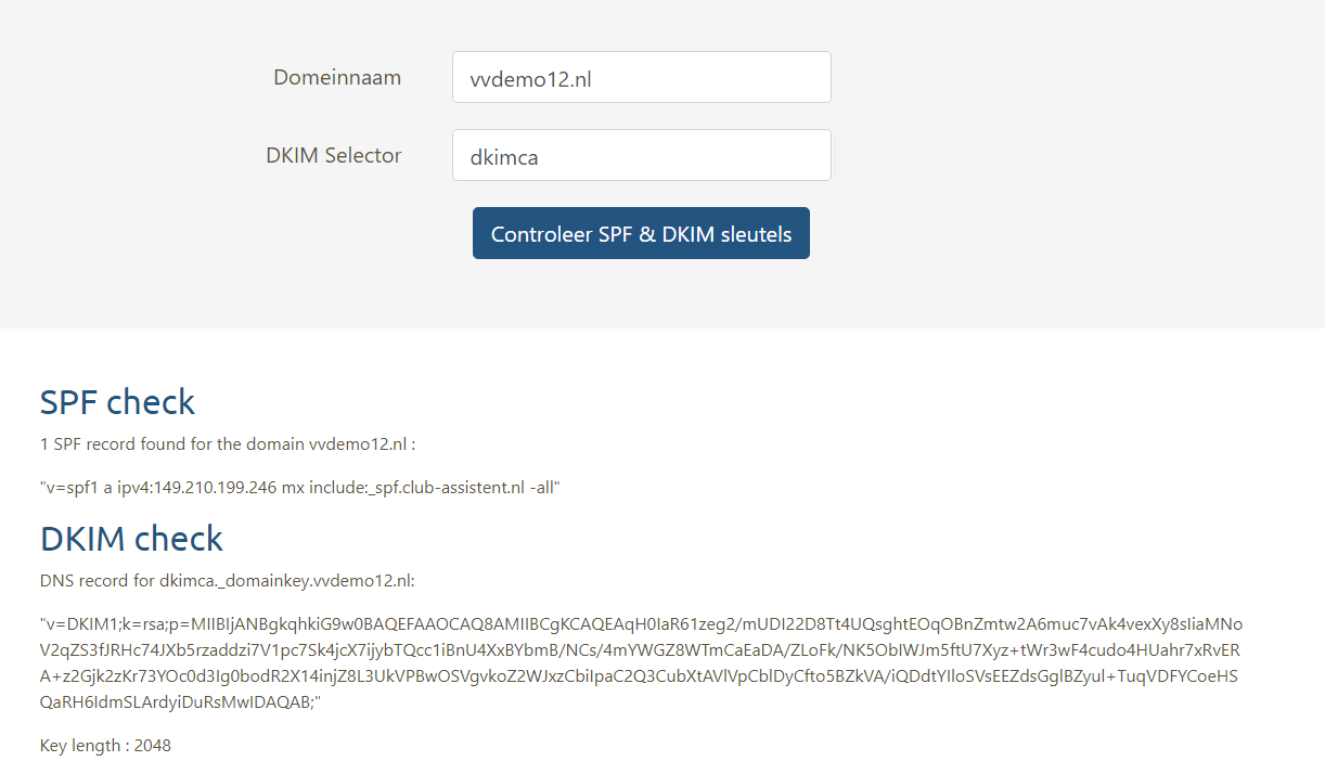 Ga naar de website https://www.mail-tester.com/spf-dkim-check en vul bij domeinnaam je website url in (www.domeinnaam.nl), vul bij DKIM Selector 'dkim' of 'dkimca' in en klik op 'Controleer SPF & DKIM sleutels'. Controleer beide DKIM opties. Als output krijg je het volgende te zien: