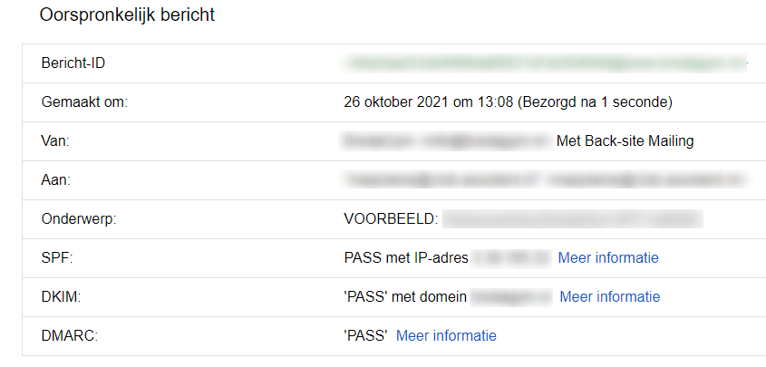 Je verstuurt de mailing (dit mag ook een voorbeeld zijn) en opent deze in Gmail. Bij deze mail klik je rechts op de 3 puntjes die naast het beantwoorden pijltje staan. In dit lijstje kies je de optie 'Origineel weergeven'. Deze actie opent een nieuw tabblad met daarin het oorspronkelijke bericht. Deze pagina toont een lijstje met gegevens van de e-mail, waaronder SPF, DKIM & DMARC staan. Deze 3 waardes moeten het woord PASS hebben om te kunnen constateren dat het juist is ingesteld.