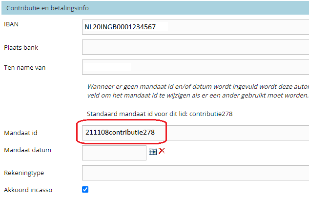 Krijg je van de bank de melding dat de incasso niet kan worden uitgevoerd omdat bij een lid een machtiging niet juist is, dan is bij dat lid waarschijnlijk het rekeningnummer aangepast. In dat geval moet bij het lid een nieuwe 'mandaad id' worden aangemaakt.