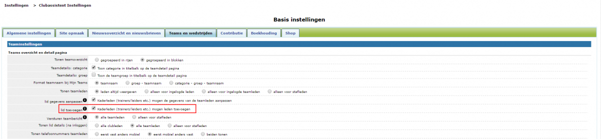 Een lid toe voegen via MyClub dient ingesteld te worden via Club-assistent. Dit doe je door in Club-assistent naar "Instellingen" te gaan. Vervolgens klik je bovenaan op "Clubinstellingen". Nu klik je in de tabbladen op "Teams en wedstrijden". Dan vink je bij "Teaminstellingen" onder "Teams overzicht en detail pagina" bij de optie lid toevoegen "Kaderleden (trainers/leiders etc.) mogen leden toevoegen aan.