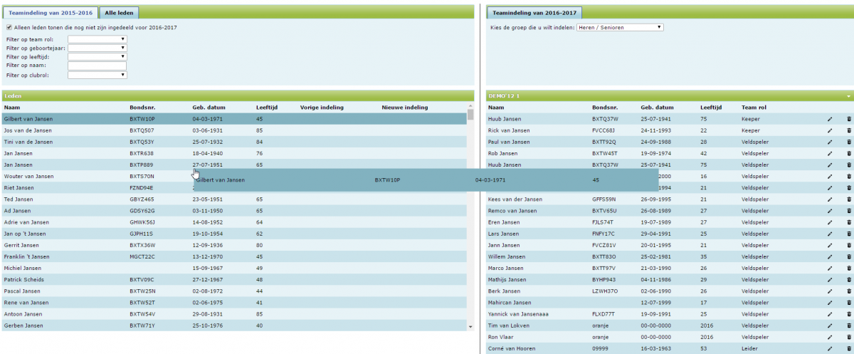 Het is in Club-assistent eenvoudig om je teams in te delen. De leden worden namelijk allemaal ingeladen en je kunt leden naar het juiste team verslepen. Je kunt ook de teamindeling van het vorige seizoen bekijken en vergelijken met het huidige seizoen.