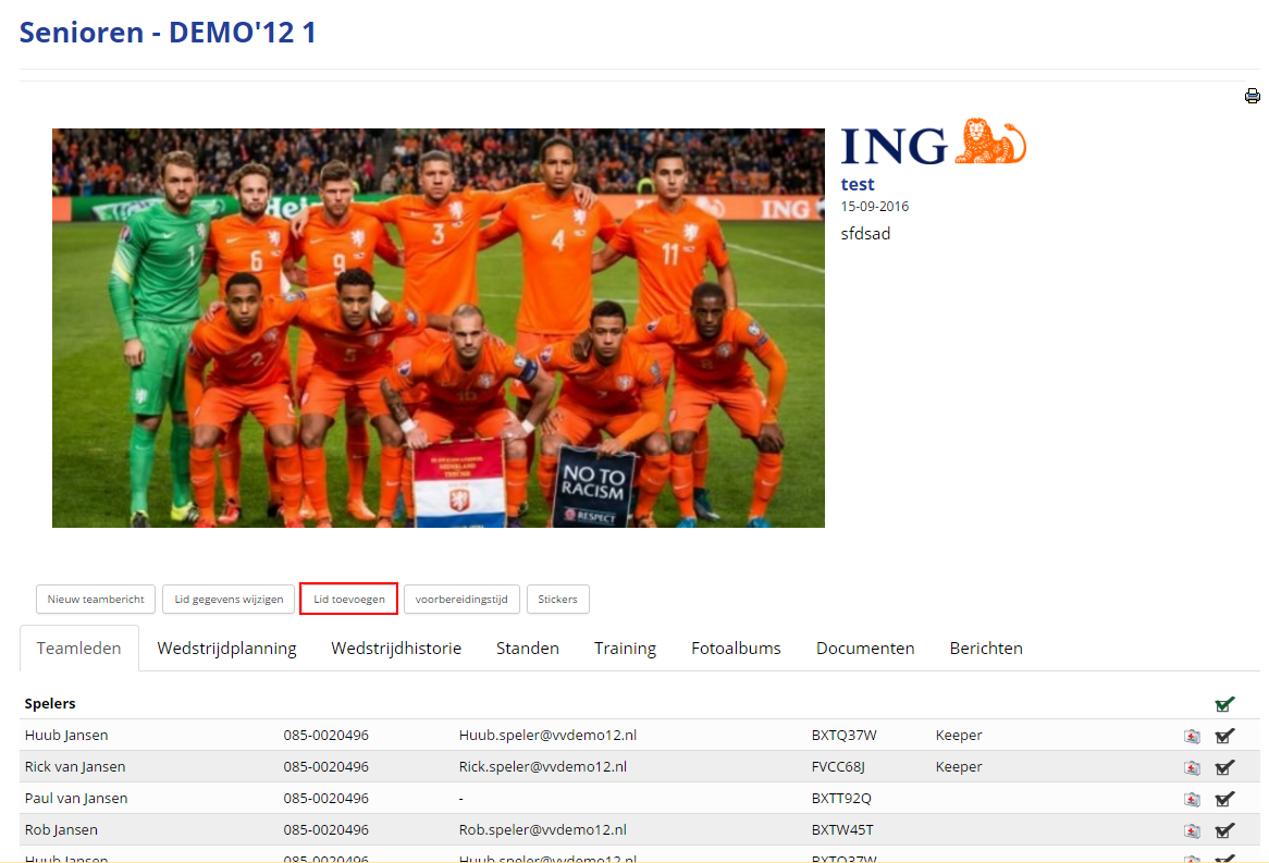 Om de teamlid informatie toe te voegen ga je in Club-assistent naar "Teams, Trainingen & Wedstrijden". Vervolgens klik je groepen huidig seizoen en kies je het plus-je voor de regel van de teamleden.