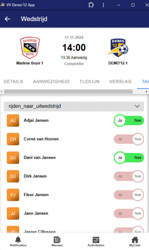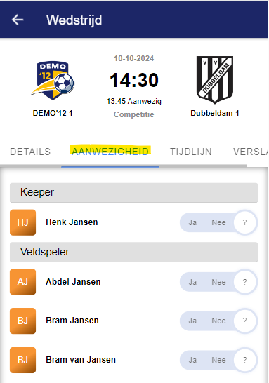 Op het tweede tabblad Aanwezigheid kan de trainer de aanwezigheid van de teamleden registreren voor deze wedstrijd.