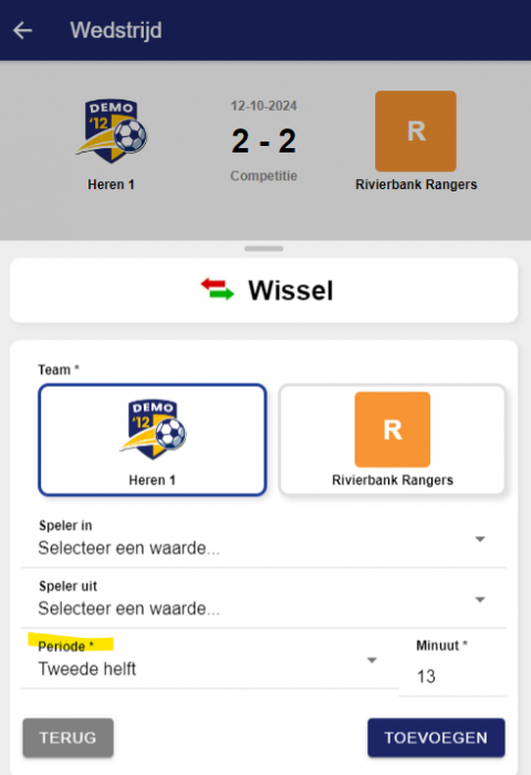 NB: zorg dat je bij de elftallen de juiste speeltijd ingesteld hebt. Op basis van de speeltijd wordt de lengte van de periodes bepaald. Heb je bij periode geen indicatie als Eerste helft (maar een cijfer 1 of 2) dan staat de speeltijd niet juist ingesteld.