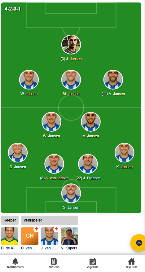 Bij de opstelling zullen de profiel foto's van de spelers gebruikt worden met daaronder de naam. Als je de rugnummers ingesteld hebt zal deze voor de naam getoond worden.