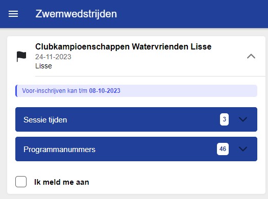 Je kunt in de app direct inschrijven op zwemwedstrijden. Ga hiervoor in het menu naar zwemwedstrijden.